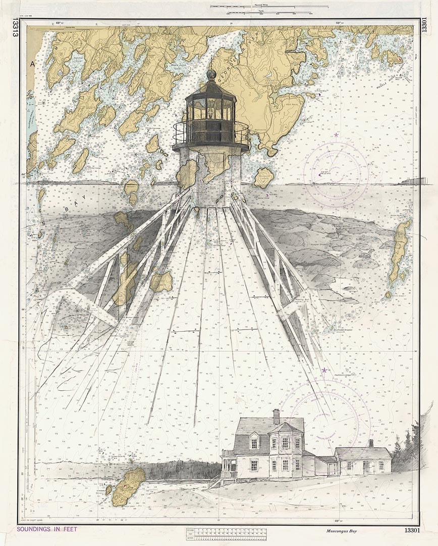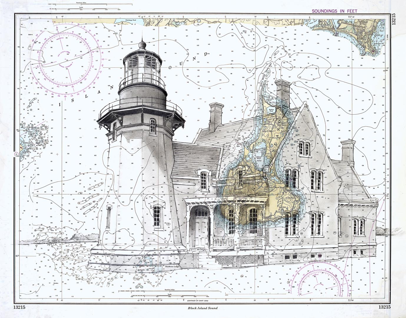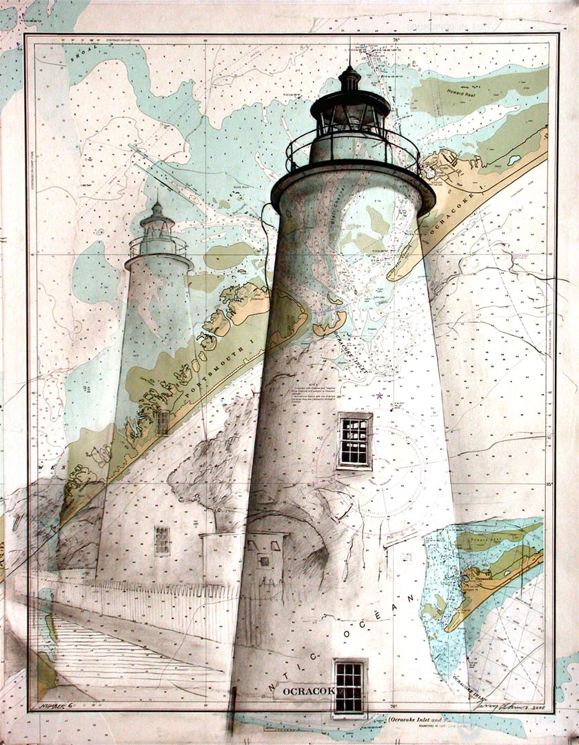 Terry Elkins’ Lighthouse Art includes drawings on nautical charts and oil paintings. There are examples from Maine, Massachusetts, Rhode Island, New York, North Carolina and Michigan. For pricing of available original works in this series, please contact the artist. Select works are also available as posters and limited-edition prints.